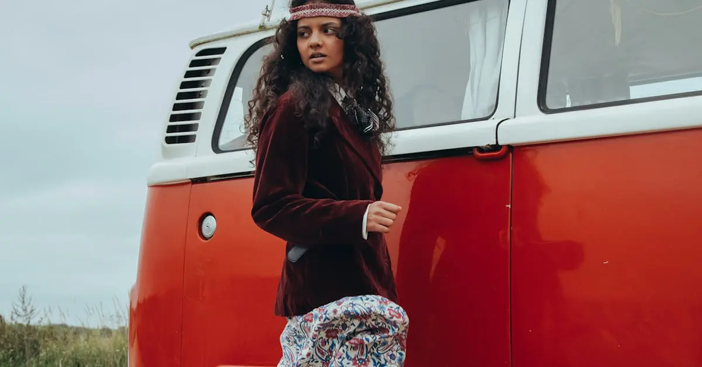 A free-spirited, eclectic look with flowing fabrics, fringe, ethnic prints, and layered accessories inspired by counterculture.