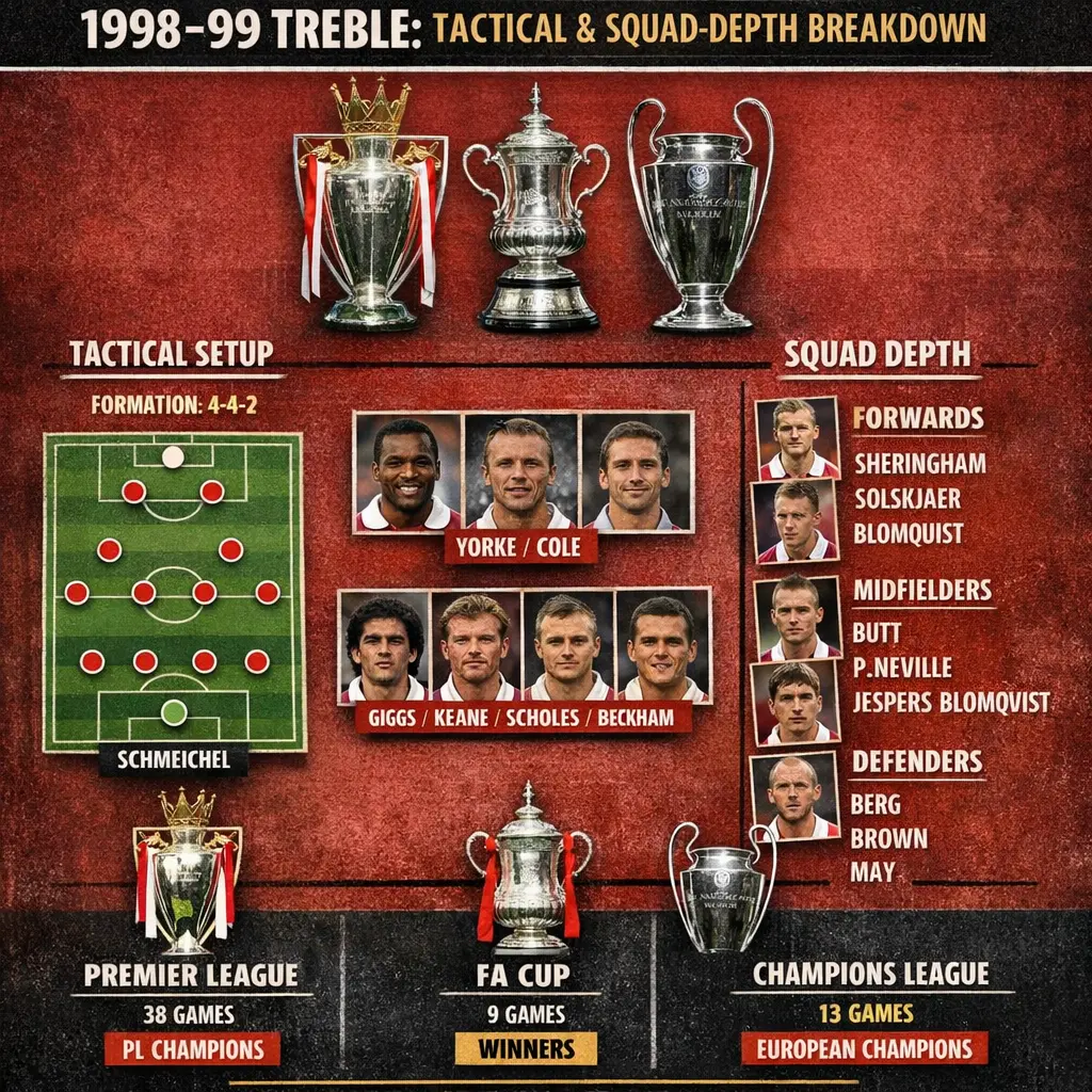 The 1998–99 treble-winning Manchester United squad relied on tactical flexibility and remarkable squad depth. Sir Alex Ferguson rotated his lineup, maximizing the strengths of players like Beckham, Giggs, Scholes, and Keane in midfield, while Yorke, Cole, Sheringham, and Solskjær provided attacking options. Defensively, the partnership of Stam and Johnsen, supported by Neville brothers and Irwin, ensured solidity. This balanced approach allowed United to compete successfully on all fronts, clinching the Premier League, FA Cup, and Champions League.