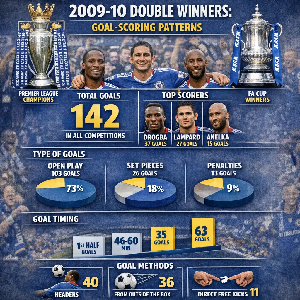 The phrase refers to Chelsea F.C.’s successful 2009-10 season, during which they won both the Premier League and FA Cup, achieving a domestic double. Their goal-scoring patterns were characterized by a prolific attack, with the team scoring a record 103 league goals. Key players like Didier Drogba and Frank Lampard contributed significantly, and Chelsea often dominated matches with high-scoring victories, showcasing fluid attacking play and clinical finishing throughout the campaign.