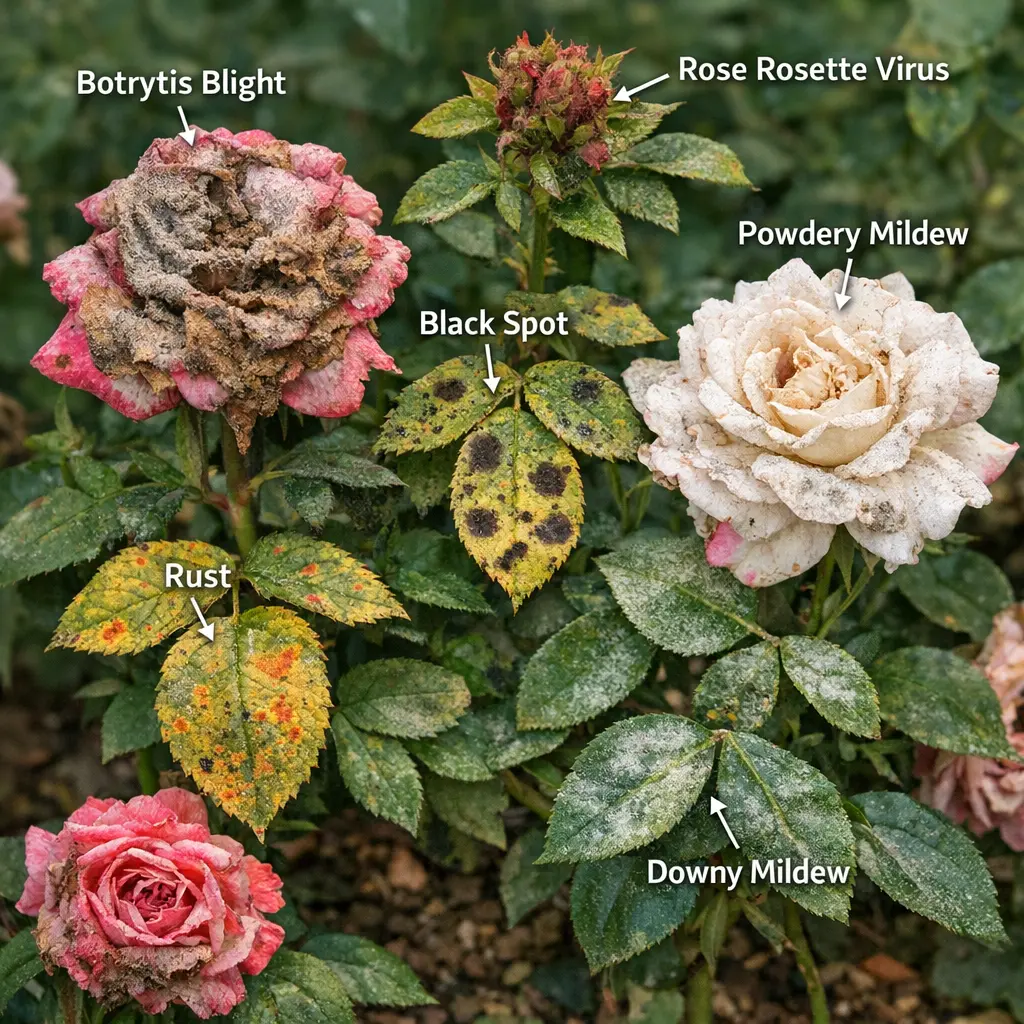 Powdery mildew: white powdery coating on leaves and buds. Black spot: round black spots with yellow halos and leaf yellowing. Downy mildew: purplish or brown blotches on the upper leaf surface. Botrytis blight: gray, fuzzy mold on buds and flowers. Rose rust: orange or yellow pustules on the undersides of leaves.