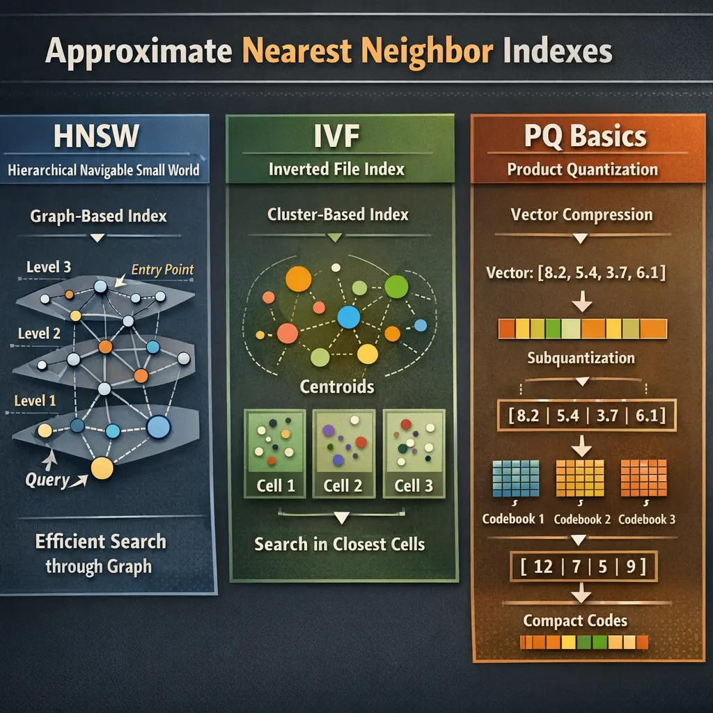 Approximate Nearest Neighbor (ANN) indexes accelerate similarity search in large datasets, essential for Retrieval-Augmented Generation (RAG). HNSW (Hierarchical Navigable Small World) builds a multi-layer graph for fast queries. IVF (Inverted File Index) clusters data and searches within relevant partitions. PQ (Product Quantization) compresses vectors into compact codes, enabling efficient distance computations. Together, these methods balance speed, memory usage, and accuracy for scalable retrieval in AI applications.