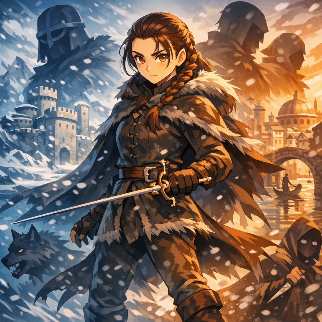 Arya Stark is a prominent character from the "Game of Thrones" series, known for her fierce independence, resilience, and skill as a fighter. The youngest daughter of House Stark, Arya rejects traditional gender roles, choosing instead to pursue swordsmanship and survival skills. Her journey takes her across Westeros and beyond, where she trains with the Faceless Men, becoming a skilled assassin. Arya's character embodies themes of identity, vengeance, and transformation.