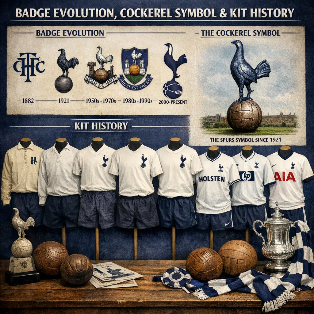 The phrase refers to the historical development of Tottenham Hotspur F.C.’s club badge, particularly the evolution of its iconic cockerel symbol, and the history of the team's kits. Over time, the badge has undergone several redesigns, with the cockerel—standing on a football—becoming a central emblem of the club. The kit history explores changes in design, colors, and manufacturers, reflecting the club’s identity and heritage through the years.