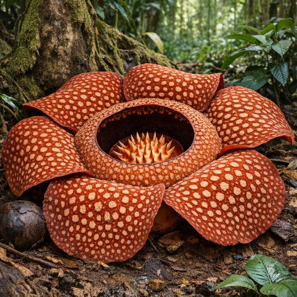 Rafflesia arnoldii blooms irregularly in Southeast Asian rainforests (Sumatra and Borneo); Amorphophallus titanum blooms infrequently in Sumatra and at select botanical gardens worldwide.
