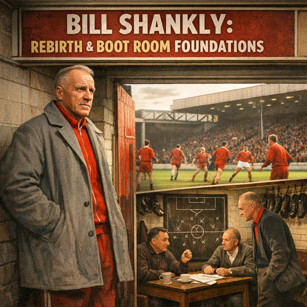 "Bill Shankly: Rebirth and Boot Room Foundations" refers to the transformative era when Bill Shankly took charge of Liverpool F.C., revitalizing a struggling club with his vision, discipline, and innovative methods. Shankly not only rebuilt the team on the pitch but also established the famous Boot Room—a hub for tactical discussions and coaching development—which became the foundation for Liverpool’s future successes and enduring footballing philosophy.