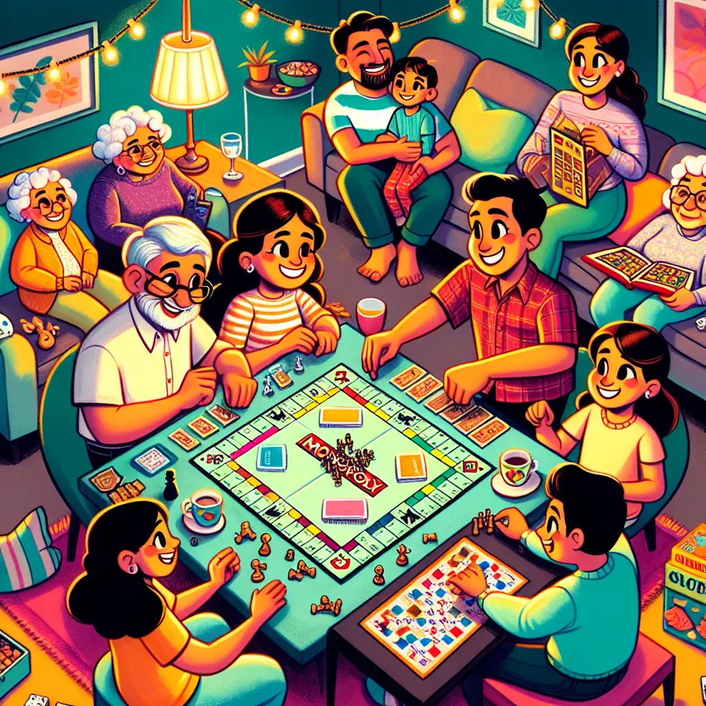 A family gathering where members play a mix of classic and modern board games to share memories, laughter, and friendly competition.