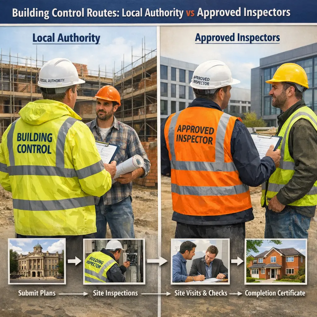 Local authority building control and private Approved Inspectors (AIs); both check compliance with Building Regulations, approve plans, and carry out site inspections.