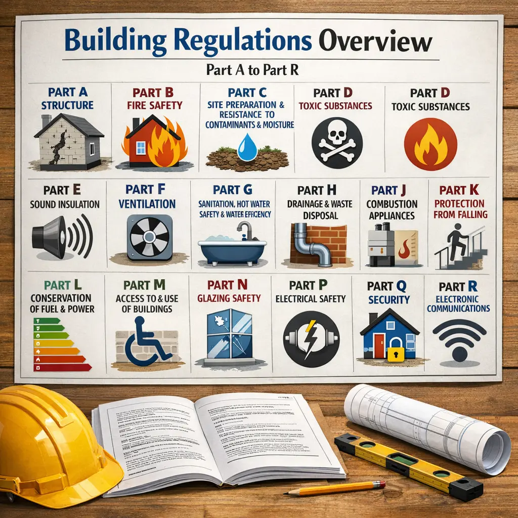 Building Regulations Parts A to R outline the legal and statutory requirements for construction in England and Wales, ensuring safety, health, energy efficiency, and accessibility in buildings. Each part addresses specific aspects, such as structural integrity (Part A), fire safety (Part B), ventilation (Part F), and electrical safety (Part P). Compliance with these regulations is mandatory for new builds, extensions, and alterations, promoting high standards and protecting occupants and the wider community.