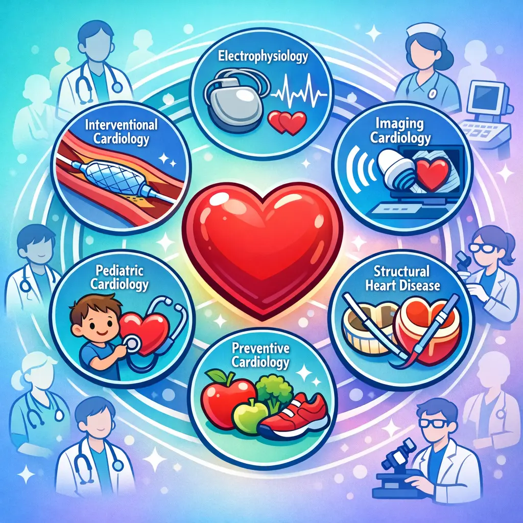 Cardiology subspecialties are focused areas within cardiology that address specific heart conditions or procedures, such as interventional cardiology, electrophysiology, heart failure/transplant, and cardiac imaging; they require additional fellowship training after general cardiology.
