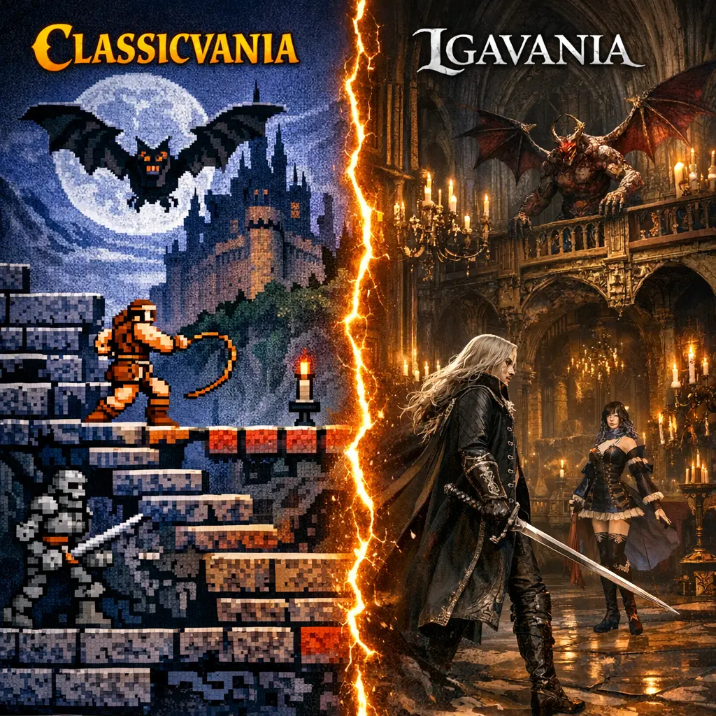 Castlevania "Classicvania" refers to the early series entries focused on linear, stage-based platforming with challenging action and limited exploration. In contrast, "Igavania" describes later games, especially those produced by Koji Igarashi, featuring open-ended, interconnected maps, RPG elements, and a focus on exploration and character progression. The distinction highlights the franchise’s evolution from straightforward action-platformers to more complex, exploration-driven experiences.