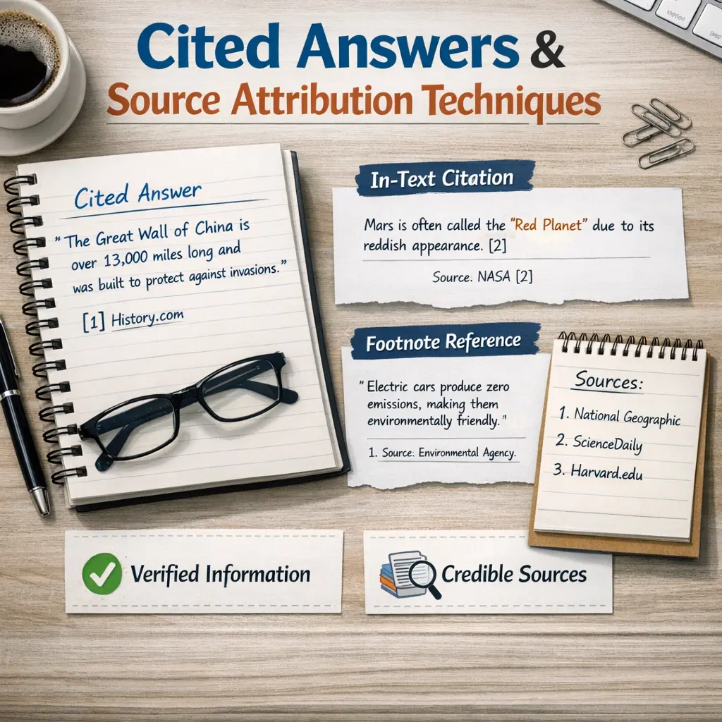 Cited Answers and Source Attribution Techniques in Retrieval-Augmented Generation (RAG) involve integrating information retrieval with generative AI models. RAG systems fetch relevant documents from external sources and use them to generate answers, ensuring responses are grounded in verifiable data. Source attribution techniques explicitly reference or cite these sources, enhancing transparency and trustworthiness by allowing users to trace the origin of information in the generated answers.