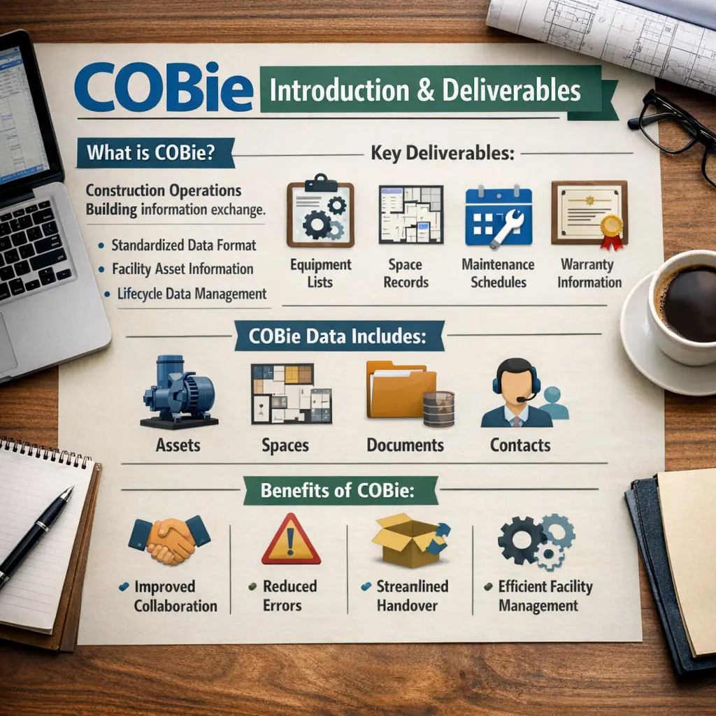 COBie (Construction-Operations Building information exchange) is a standardized data format used in the construction industry to capture and deliver essential information about a building’s assets. It facilitates digital applications by organizing data related to equipment, spaces, systems, and components throughout a project's lifecycle. COBie deliverables include structured spreadsheets or digital files that enable efficient information exchange between project stakeholders, supporting operations, maintenance, and facility management after construction is complete.