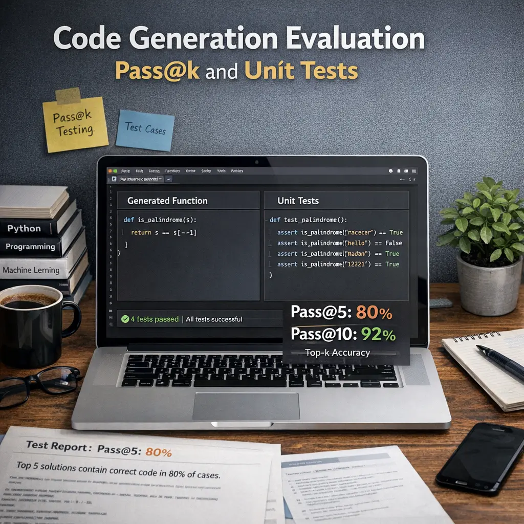 Code Generation Evaluation involves assessing how well language models generate correct code. Pass@k measures the likelihood that at least one of the top-k generated code samples solves a given problem, providing a quantitative success rate. Unit tests are used to automatically verify code correctness by running generated code against predefined test cases. Together, these methods help benchmark and compare LLM performance in code synthesis tasks, ensuring reliable and accurate code generation.