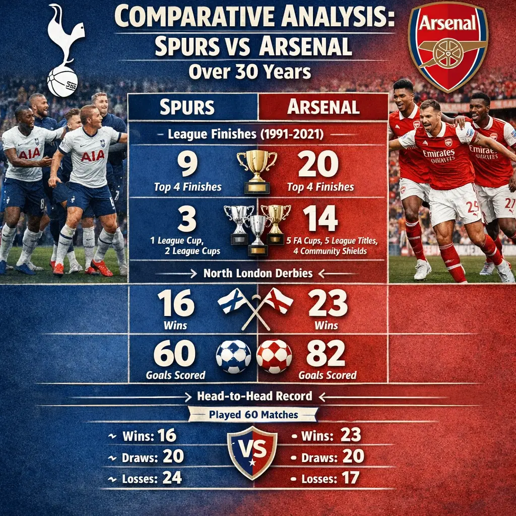 This phrase refers to an in-depth examination of the performances, achievements, and developments of Tottenham Hotspur F.C. (Spurs) compared to Arsenal F.C. over the past 30 years. The analysis typically covers league standings, trophy wins, head-to-head results, financial growth, fanbase evolution, and managerial changes, aiming to highlight trends, periods of dominance, and shifts in club stature between these two North London football rivals.