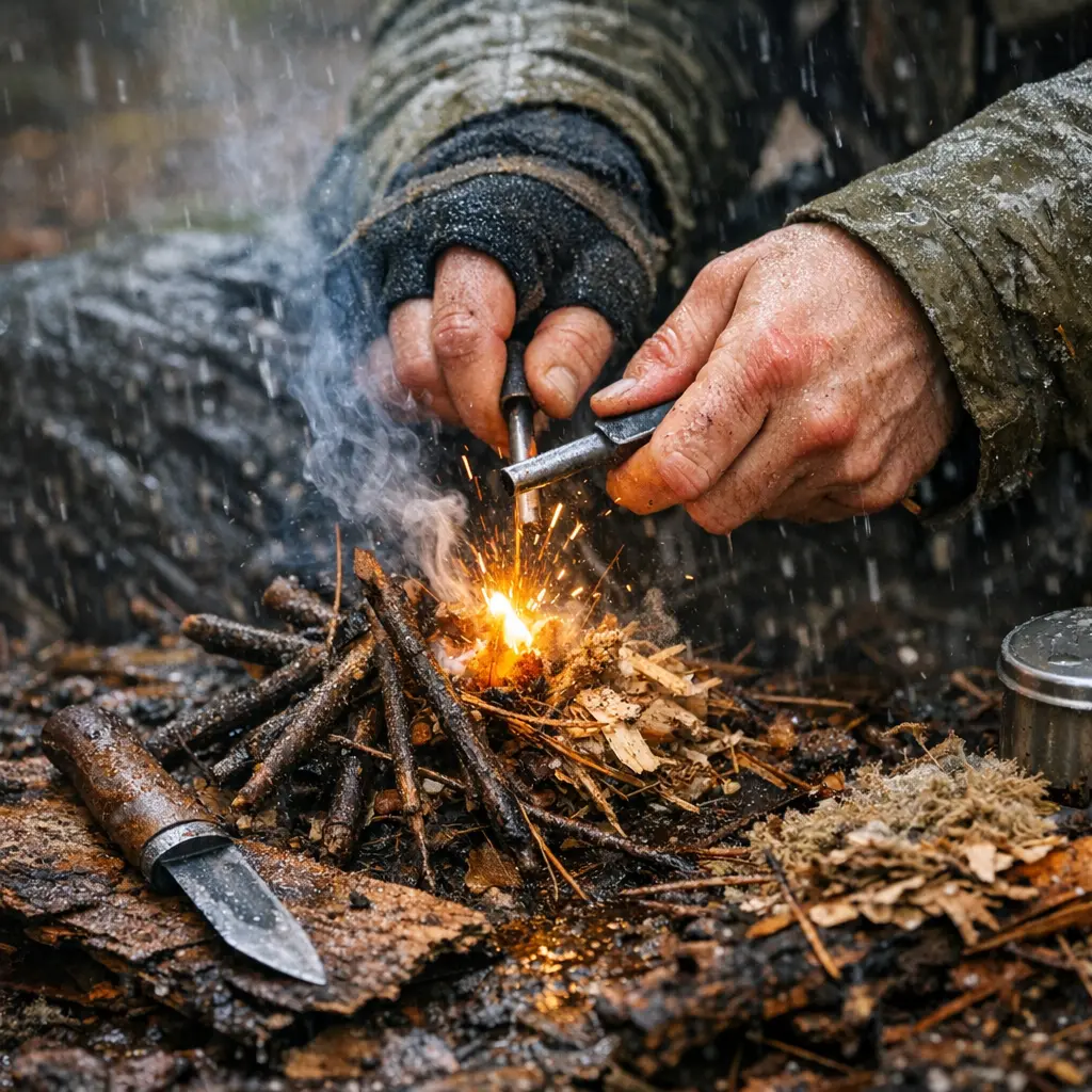 Carry reliable fire-starting tools, keep dry tinder in a waterproof container, and consider non-fire warmth options if conditions prevent safe lighting.