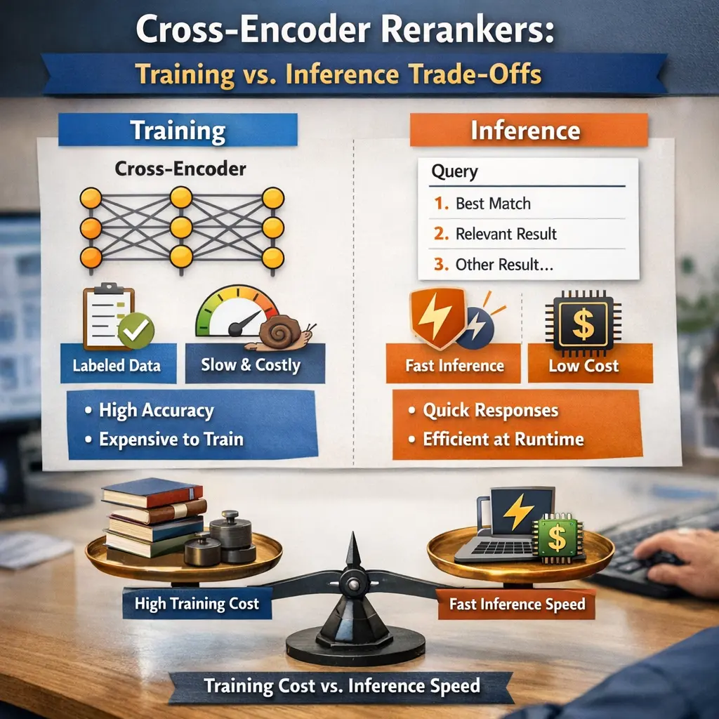 Cross-Encoder Rerankers are models used in Retrieval-Augmented Generation (RAG) to improve the quality of retrieved documents by jointly encoding query and candidate passages for relevance scoring. During training, they achieve high accuracy but are computationally expensive since each query-passage pair is processed together. In inference, this leads to slower performance compared to bi-encoders, creating a trade-off between retrieval effectiveness and efficiency. The choice depends on application requirements for speed versus accuracy.