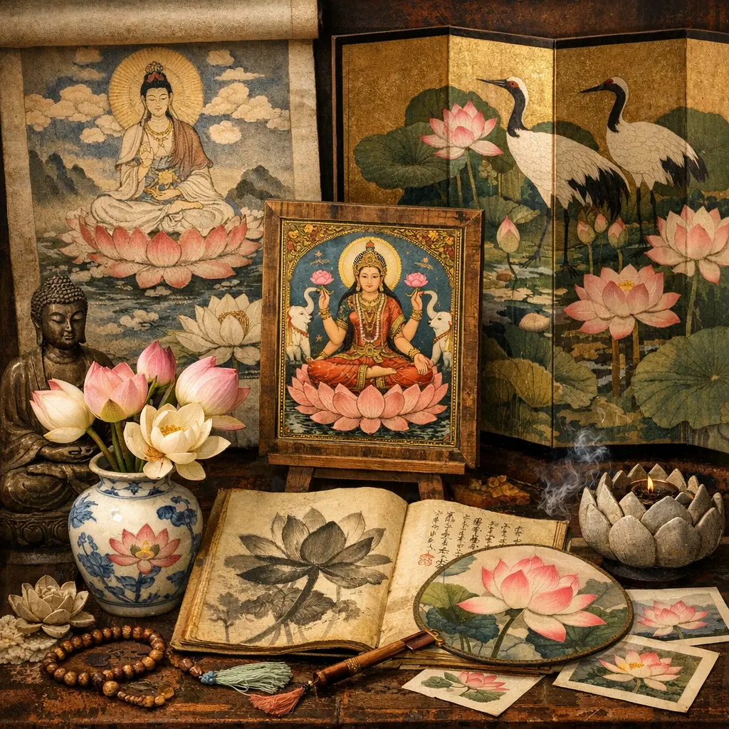 Lotus motifs appear in Indian temple sculpture and metalwork, Buddhist statues and paintings across Asia, and Chinese/Japanese ceramics and painting, as well as Southeast Asian temple art.