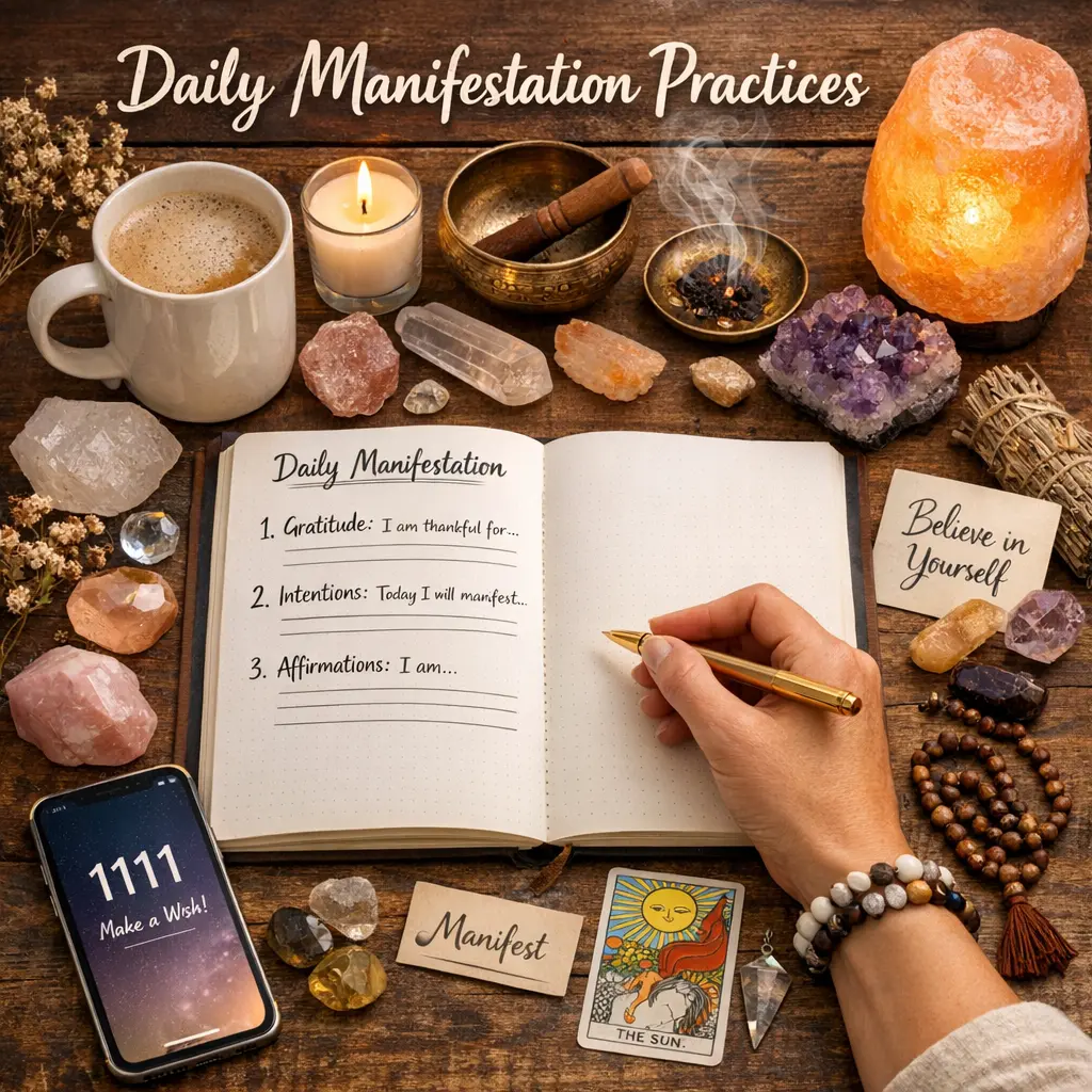 Daily manifestation typically includes setting clear intentions, visualization, affirmations, gratitude, journaling, and taking aligned actions each day to move toward your goals.