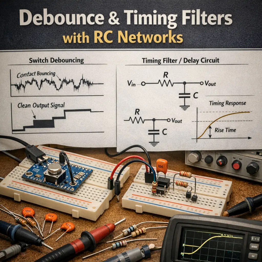 Debounce and timing filters using RC networks are essential in digital electronics to eliminate unwanted noise or rapid fluctuations caused by mechanical switches or signal transitions. An RC (resistor-capacitor) network smooths out these irregularities by charging and discharging the capacitor, effectively filtering out short, spurious signals. This ensures that only stable, valid transitions are recognized by digital circuits, improving reliability in computing systems and preventing false triggering or multiple counts from a single switch press.