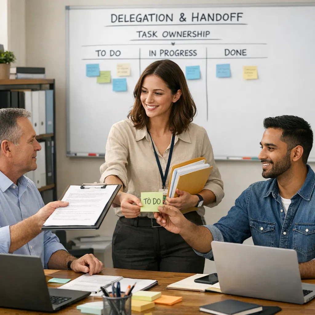 Ownership defines the accountable party, delegation assigns tasks, and handoffs move work between people or teams. Together, they ensure clear responsibility, continuity, and smooth transitions throughout a project.