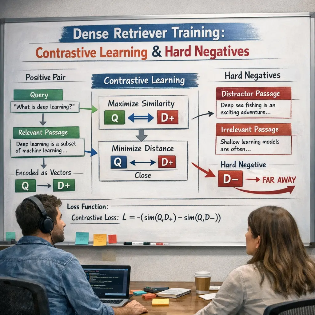 Dense Retriever Training with contrastive learning involves teaching a model to distinguish between relevant (positive) and irrelevant (negative) document-query pairs. Hard negatives—examples that are similar but incorrect—are especially valuable, as they force the model to learn subtle distinctions. In Retrieval-Augmented Generation (RAG), this process improves the retriever’s ability to fetch accurate, contextually relevant documents, which are then used by a generator to produce more informed and precise responses.