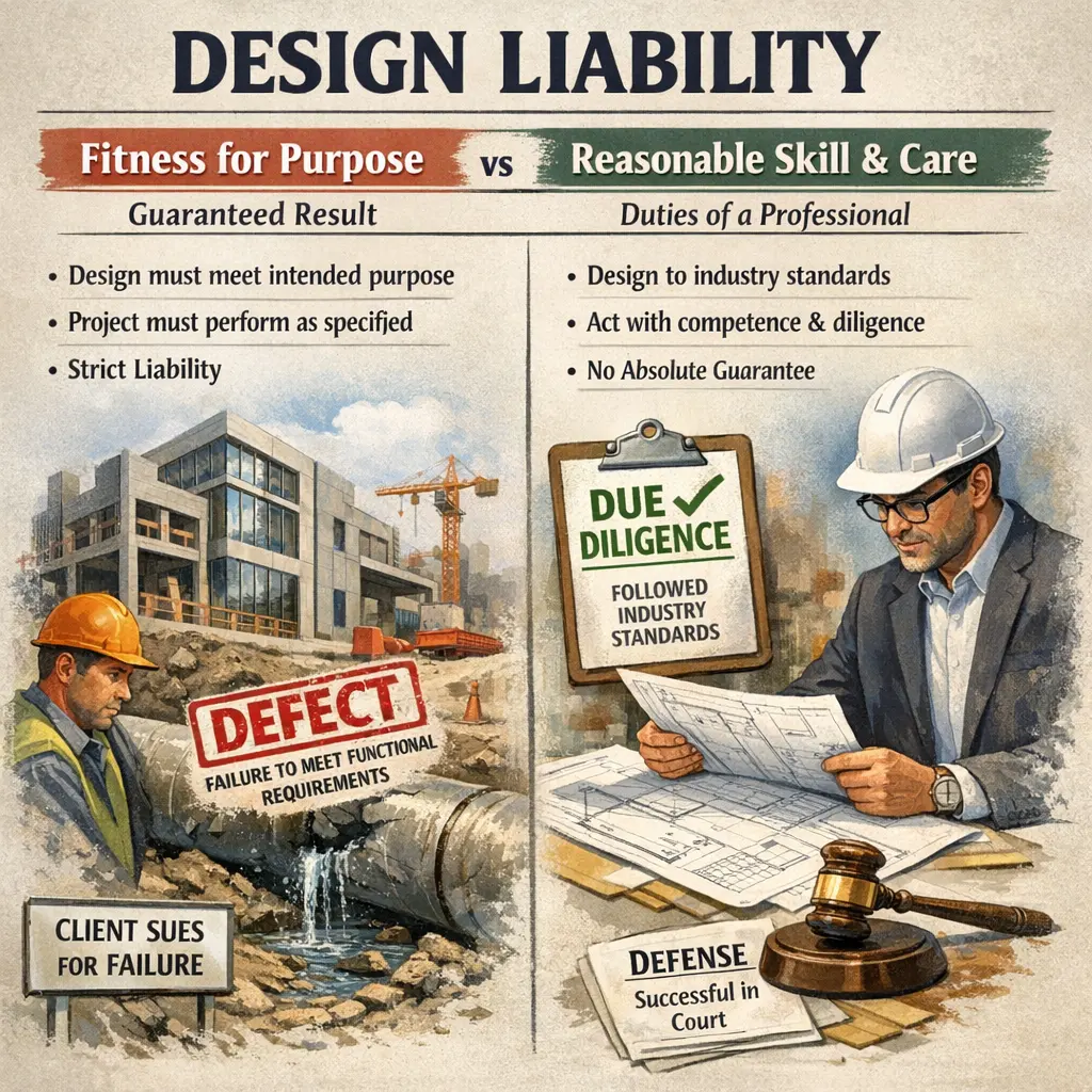 Design liability and fitness for purpose require that a design meets the specific intended function, ensuring it is suitable and safe for its purpose. In contrast, reasonable skill and care obligate designers or professionals to perform their duties to the standard expected of a competent person in their field. Legal and statutory requirements may dictate which standard applies, impacting the extent of responsibility and potential liability for design defects or failures.