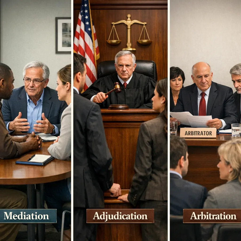 How do mediation, adjudication, and arbitration differ?