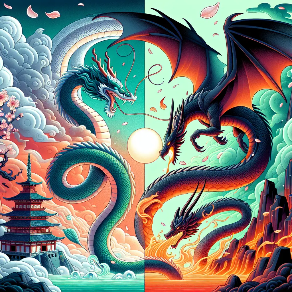 Western dragons are usually winged, fire-breathing, and depicted as powerful, often malevolent guardians of treasure. Eastern dragons tend to be serpentine and wingless, associated with water, rain, wisdom, and auspicious power, and are typically benevolent or protective.
