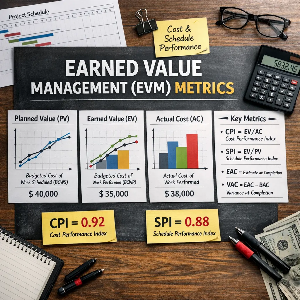 Earned Value Management (EVM) metrics are quantitative tools used in project management to assess project performance and progress. By integrating project scope, schedule, and cost data, EVM metrics such as Planned Value (PV), Earned Value (EV), and Actual Cost (AC) enable managers to measure project health, forecast future performance, and identify variances. These metrics support informed decision-making, ensuring effective financial management and adherence to business practices throughout the project lifecycle.