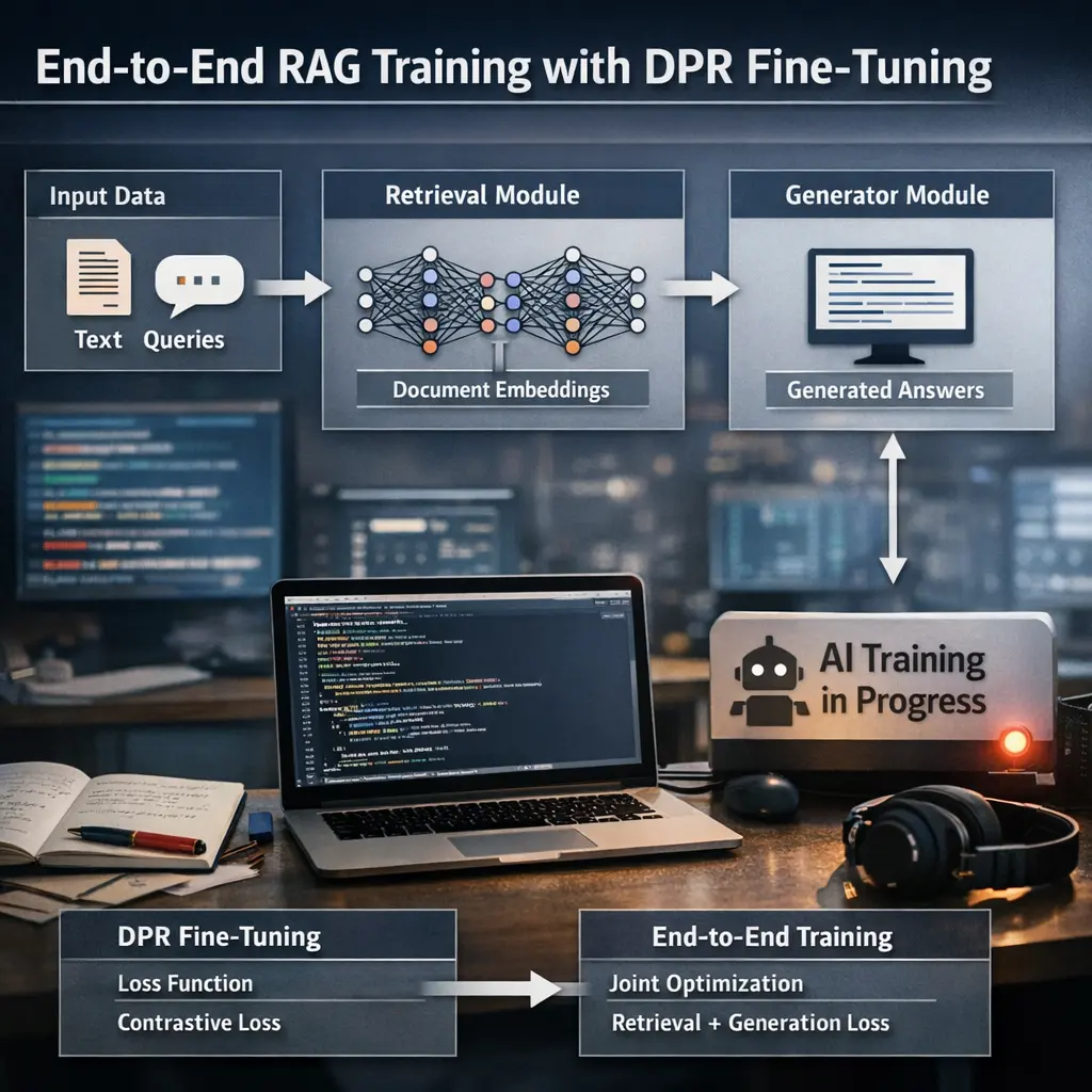 End-to-End RAG Training with DPR Fine-Tuning (Advanced RAG Techniques) refers to a comprehensive process where a Retrieval-Augmented Generation (RAG) model is trained holistically, integrating both its retriever and generator components. In this approach, the Dense Passage Retriever (DPR) is fine-tuned alongside the generator, allowing the system to better select and utilize relevant documents during generation. This advanced method enhances answer accuracy and relevance by optimizing retrieval and generation in tandem.