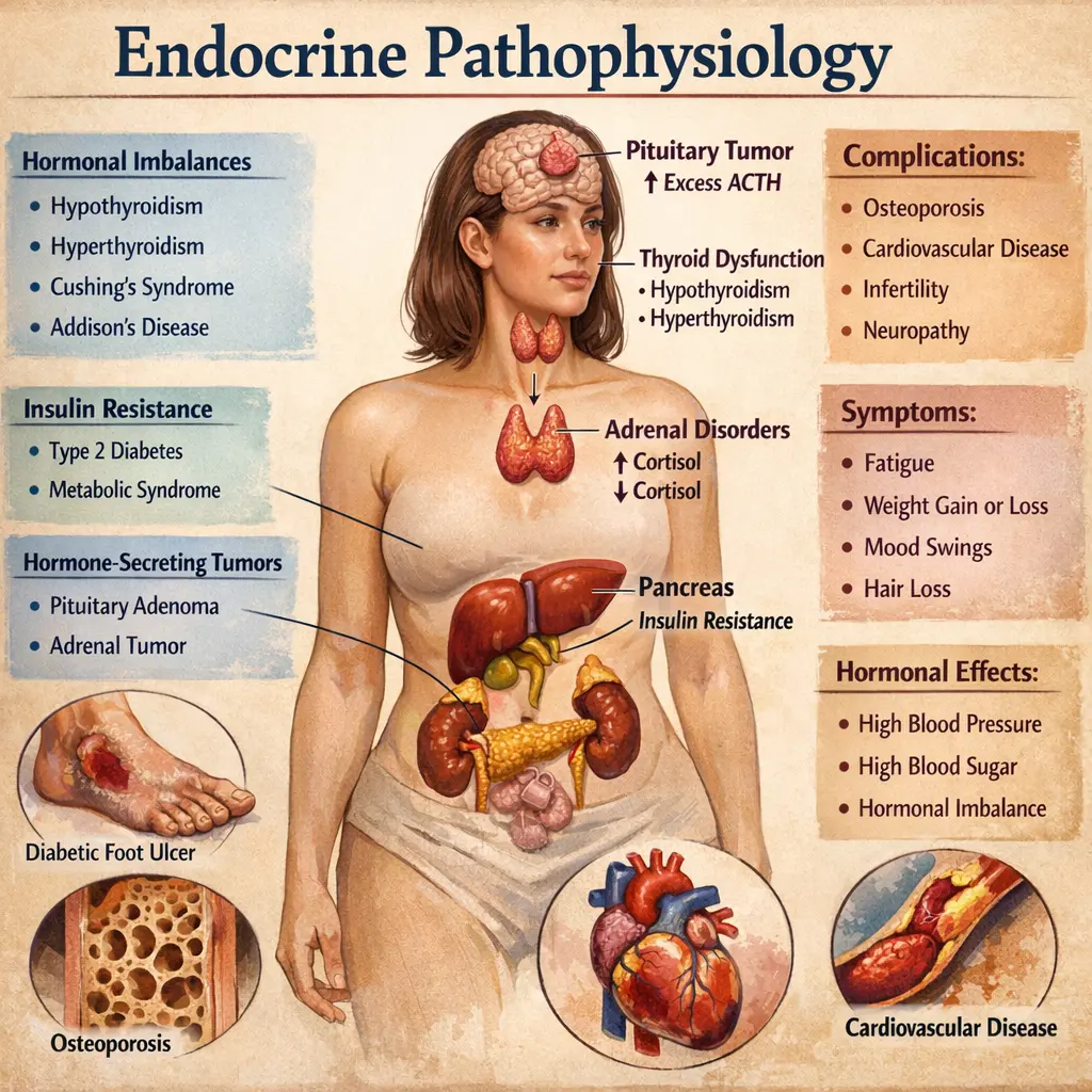 Endocrine pathophysiology refers to the study of disorders within the body’s hormone-producing glands, such as the thyroid, pancreas, and adrenal glands. These glands release hormones that regulate essential functions like metabolism, growth, and reproduction. When there is dysfunction—such as overproduction or underproduction of hormones—it leads to various health issues, including diabetes, thyroid disorders, and growth abnormalities, highlighting the critical role of endocrine balance in overall human health.