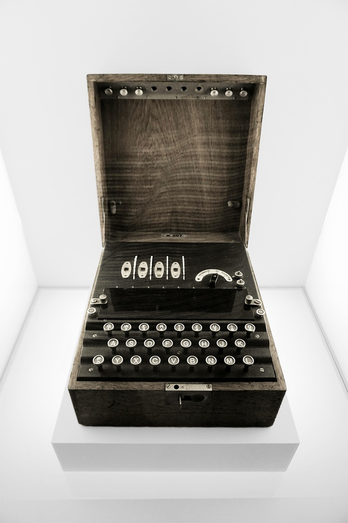 A cipher device used mainly by Germany in WWII to encrypt radio messages, using rotors, a reflector, and a plugboard to scramble letters.
