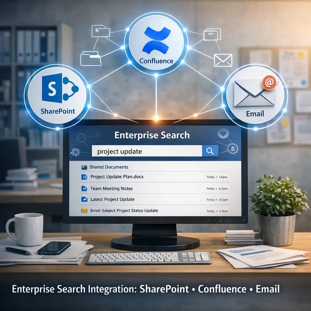 What is enterprise search integration across SharePoint, Confluence, and Email?