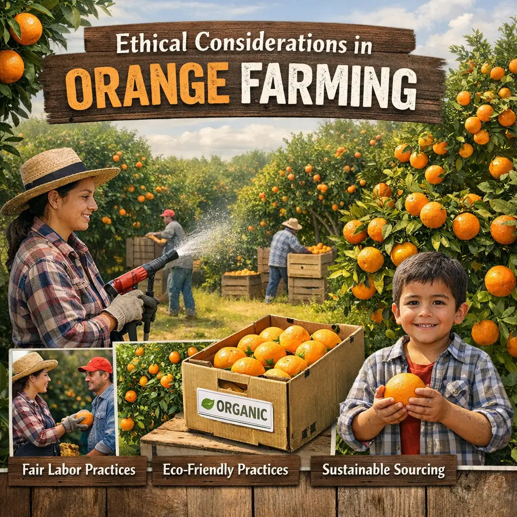Ethical considerations in orange farming involve ensuring fair labor practices, minimizing environmental impact, and promoting sustainability. This includes providing safe working conditions, fair wages, and respecting workers’ rights. Additionally, ethical practices require responsible use of pesticides and water resources to protect ecosystems. Transparent supply chains and support for local communities further contribute to ethical orange and cherry production, ensuring that fruit reaches consumers without exploitation or harm to people and the environment.