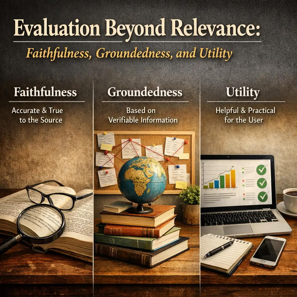 Evaluation beyond relevance in Retrieval-Augmented Generation (RAG) involves assessing not just whether generated content is pertinent to a query, but also its faithfulness (accuracy to source material), groundedness (clear connection to retrieved evidence), and utility (practical usefulness to the user). This comprehensive approach ensures that AI-generated responses are not only relevant, but also reliable, well-supported, and genuinely helpful in addressing user needs.