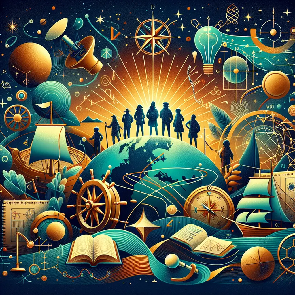 Navigation techniques (compass, stars, ships), cartography (mapmaking), geographic knowledge, and the idea of cross-cultural encounters and exchanges.