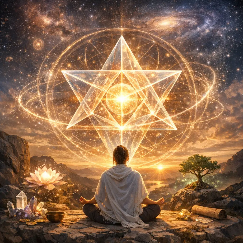 The Merkaba is a spiritual concept describing a light body or energy field around the body, formed by two interlocking tetrahedra. It symbolizes expanded consciousness, protection, and multidimensional awareness used in meditation and energy work.