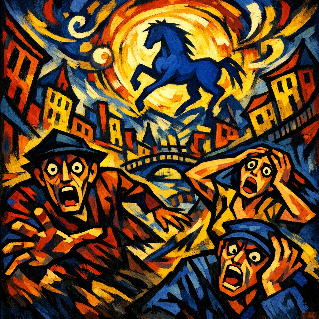Die Brücke aimed for raw, urban energy with angular figures; Der Blaue Reiter pursued spirituality and color symbolism, moving toward more abstract and symbolic imagery.