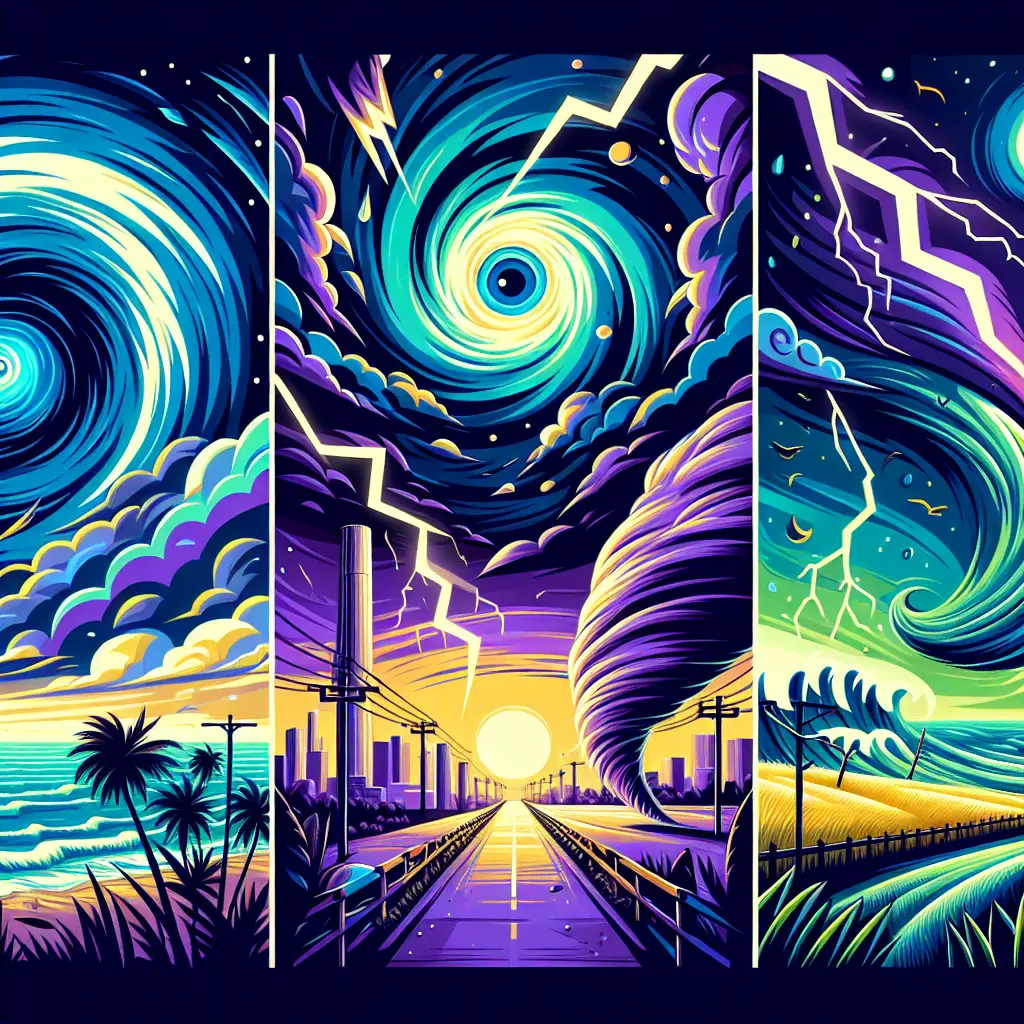 Common types include hurricanes/typhoons, tornadoes, heatwaves, floods, droughts, blizzards, and severe thunderstorms.