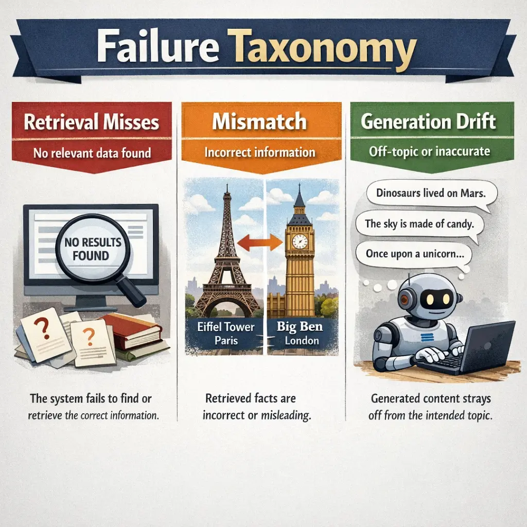Failure taxonomy in Retrieval-Augmented Generation (RAG) identifies key error types: Retrieval Misses occur when relevant documents are not fetched; Mismatch refers to retrieved documents being irrelevant or only loosely connected to the query; Generation Drift happens when the model’s output diverges from the retrieved evidence, introducing inaccuracies. Understanding these failures helps improve RAG systems by targeting retrieval accuracy, document relevance, and faithful generation based on sourced information.