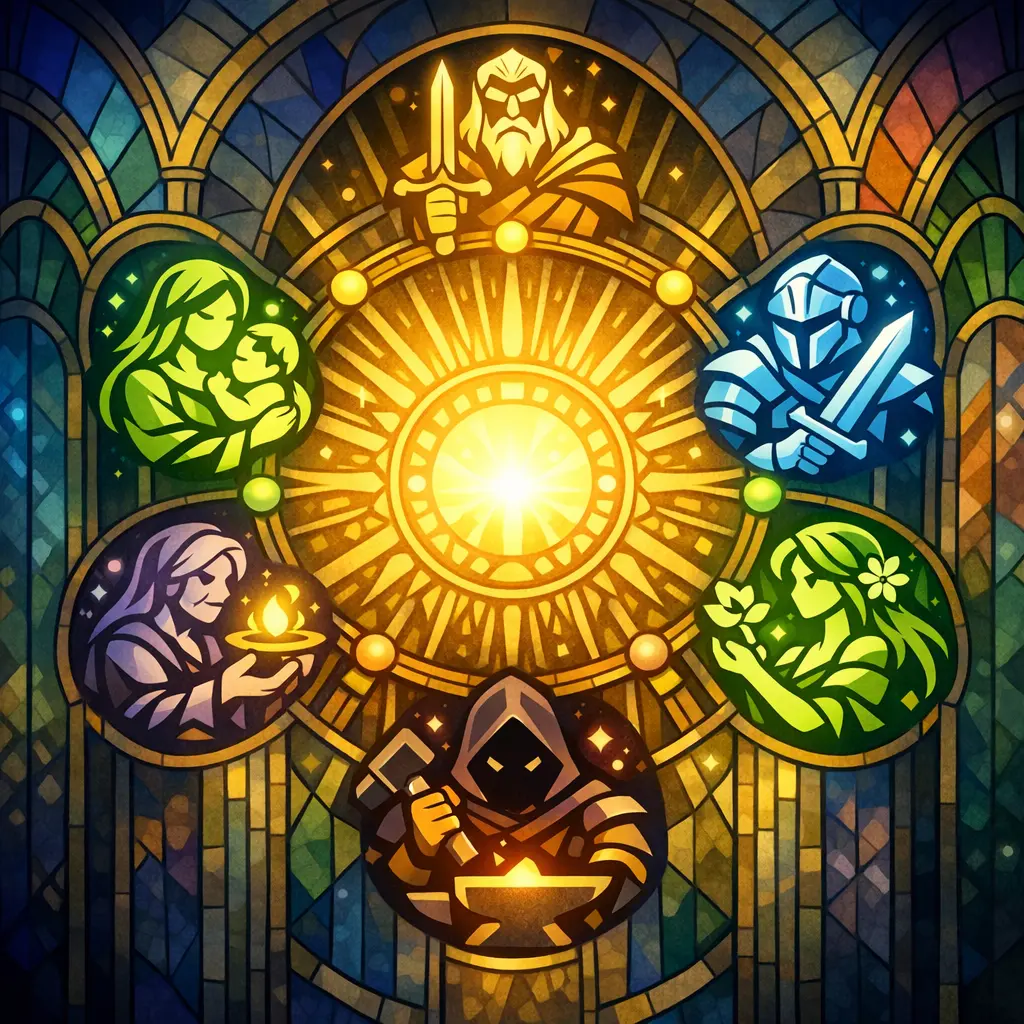 The Seven are The Father (justice), The Mother (mercy), The Warrior (courage), The Maiden (youth and innocence), The Smith (craft and labor), The Crone (wisdom), and The Stranger (death and fate). Followers turn to the aspect that fits their needs.