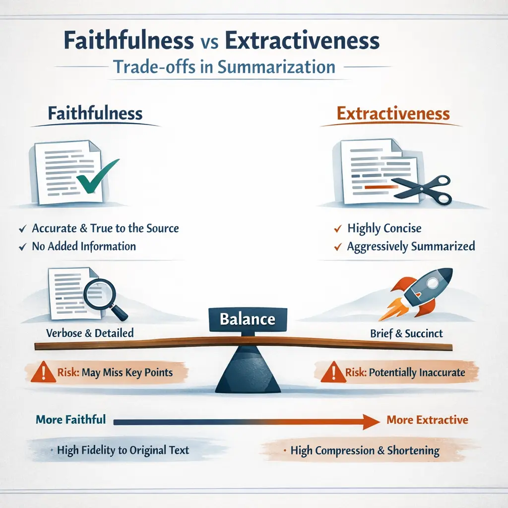 More extractiveness can preserve precise wording but may be less concise; less extractiveness (more paraphrase) risks losing nuance or introducing errors if not careful. The goal is to stay faithful while being concise.