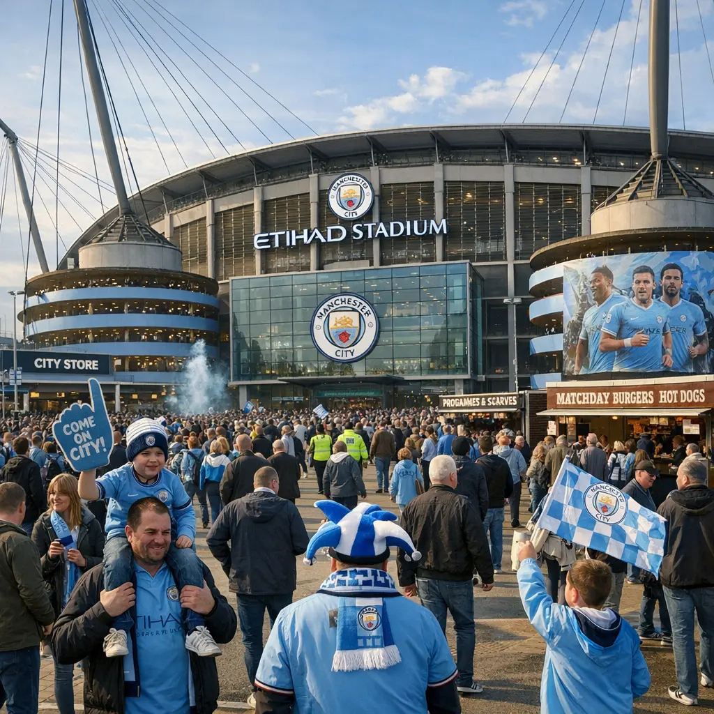 Etihad Stadium is Manchester City's home ground in Manchester. On matchdays, fans watch Premier League games, soak up pre‑match atmosphere, and enjoy in‑stadium entertainment and half‑time activities.