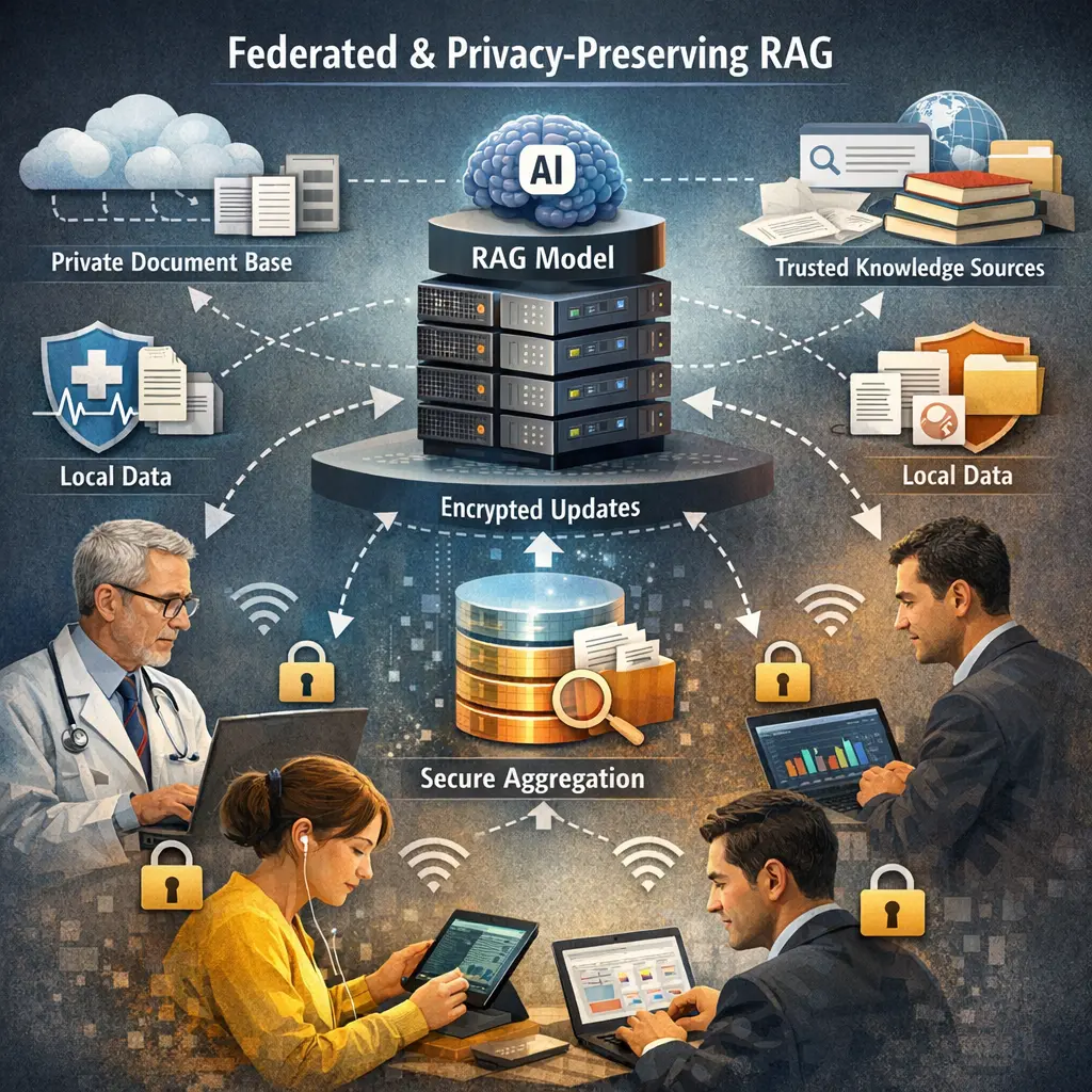 Federated and Privacy-Preserving RAG refers to advanced Retrieval-Augmented Generation (RAG) techniques that enable multiple data sources or clients to collaboratively train or use language models without sharing raw data. By leveraging federated learning and privacy mechanisms such as differential privacy or secure aggregation, these methods ensure sensitive information remains confidential while still allowing the model to retrieve relevant knowledge and generate accurate responses across distributed environments.