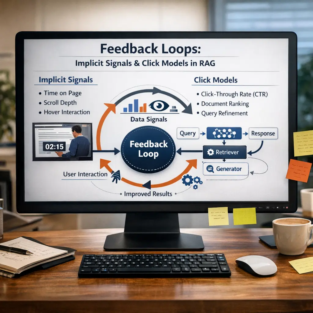 Feedback loops in RAG involve using implicit signals—such as user clicks, dwell time, and interaction patterns—to refine retrieval and generation processes. Click models analyze these signals to infer user preferences and satisfaction, enabling continuous improvement of the system by updating retrieval rankings and generation outputs. This iterative feedback mechanism helps RAG models better align with user intent, enhancing relevance and accuracy over time without relying solely on explicit user feedback.