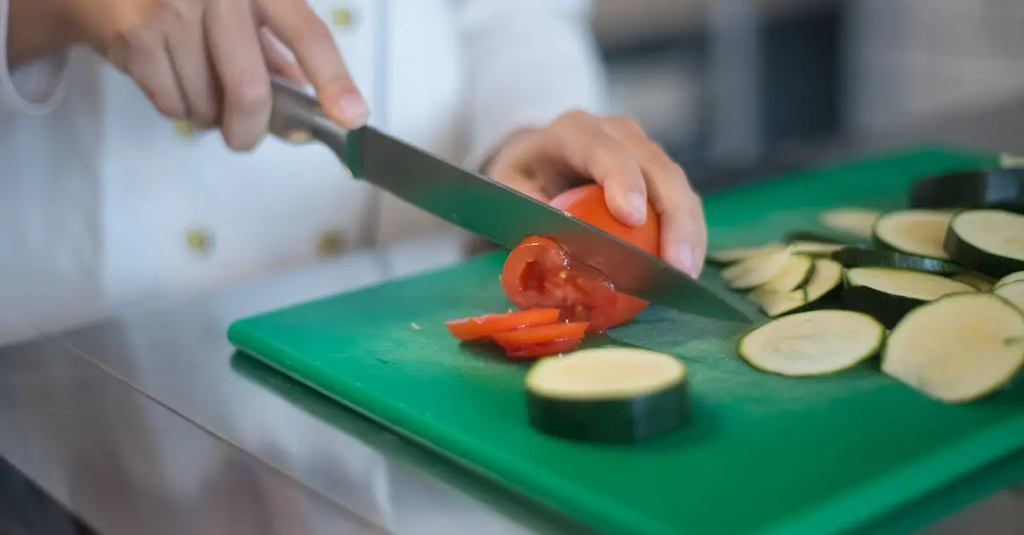 Tuck fingertips under (fingers curved) and guide the blade with your knuckles. This protects fingertips and improves control.