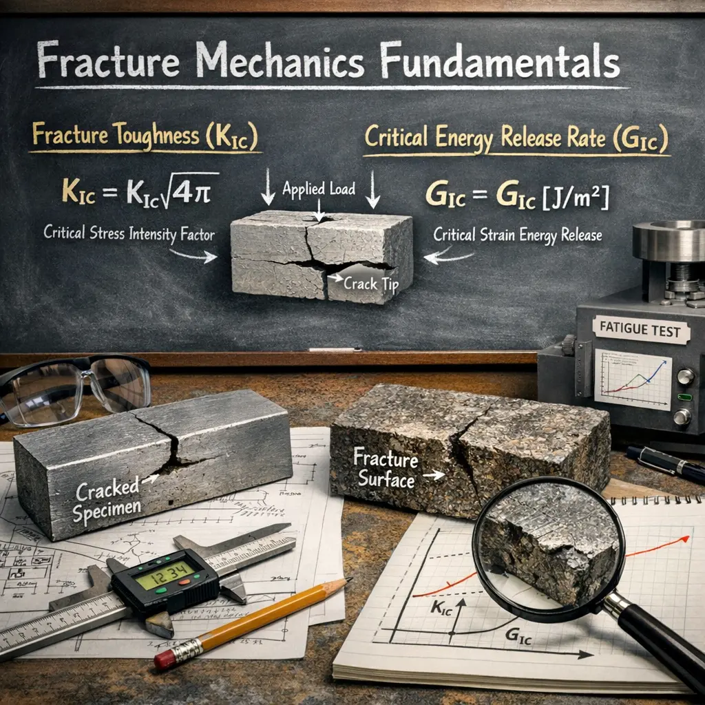 Fracture Mechanics Fundamentals involve studying how and why materials crack or fail under stress. Key parameters include KIC (fracture toughness in mode I, or opening mode) and GIC (critical energy release rate in mode I). These properties help engineers predict a material’s resistance to crack growth, ensuring safe and reliable design in structures. Understanding KIC and GIC is essential in materials science for preventing catastrophic failures in engineering components.