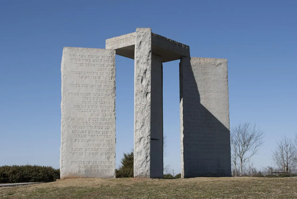 A granite monument erected in 1980 near Elberton, Georgia, commissioned under the pseudonym R.C. Christian. It bears inscriptions in eight modern languages and four ancient languages.