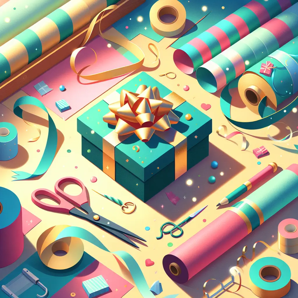 Gift wrapping and ribbons refer to the decorative materials used to present gifts in an attractive and festive manner. Wrapping paper is used to cover the gift, often featuring colorful patterns or designs, while ribbons add a finishing touch, tied around the package in bows or curls. Together, they enhance the appearance of the gift, making it feel more special and thoughtful for the recipient during celebrations or special occasions.