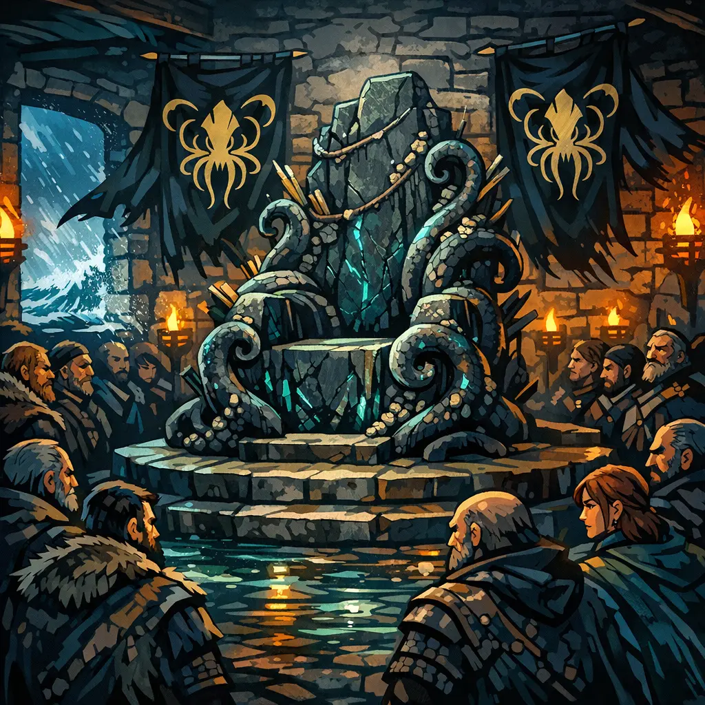 The Greyjoy Kingsmoot is a traditional Ironborn assembly where eligible captains gather to elect a new ruler, known as the King of the Isles and the North. This ceremony takes place on Old Wyk, with candidates presenting their claims and supporters. The Seastone Chair, an ancient throne carved from a block of oily black stone, serves as the symbol of the Greyjoys’ authority, and whoever claims it is recognized as the ruler of the Iron Islands.